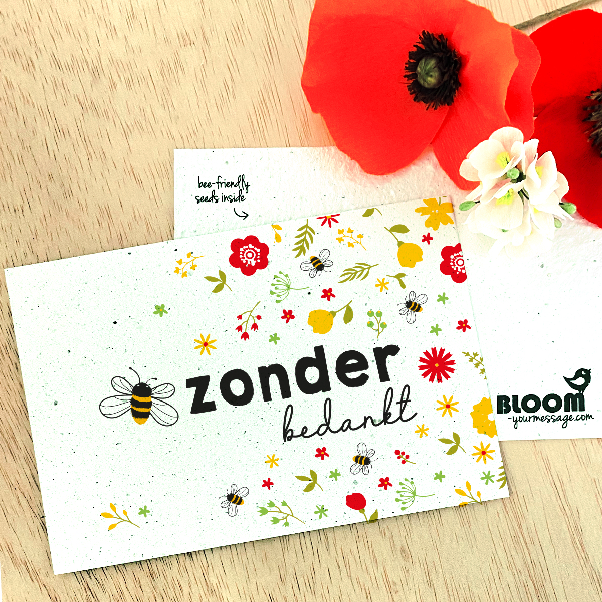 Enkele bloeikaart van gerecycled karton en katoen op A-6 formaat met daarin een mix van bij-vriendelijke wilde bloemenzaden.