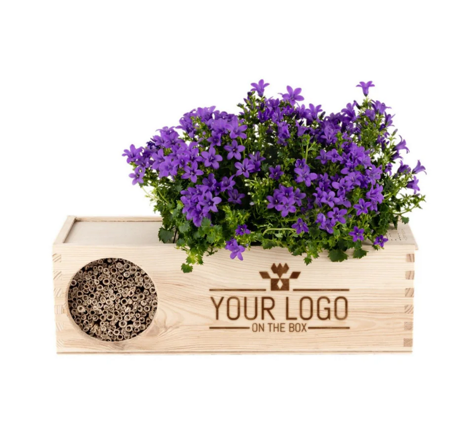 Deze bijzondere Blooms & Bees out of the Box is hét relatiegeschenk voor het voorjaar en wordt geleverd met jouw logo of slogan naar keuze. Dit kan al vanaf 15 stuks. De unieke combinatie van 2 nectarrijke Campanula planten met een bijenhotel brengt meer kleur én leven in je tuin, terras of balkon. De box is gemaakt van 100% duurzame materialen en wordt CO2-neutraal geproduceerd. De verzendverpakking is óók plantenbak, bijenhotel en waterreservoir in 1.