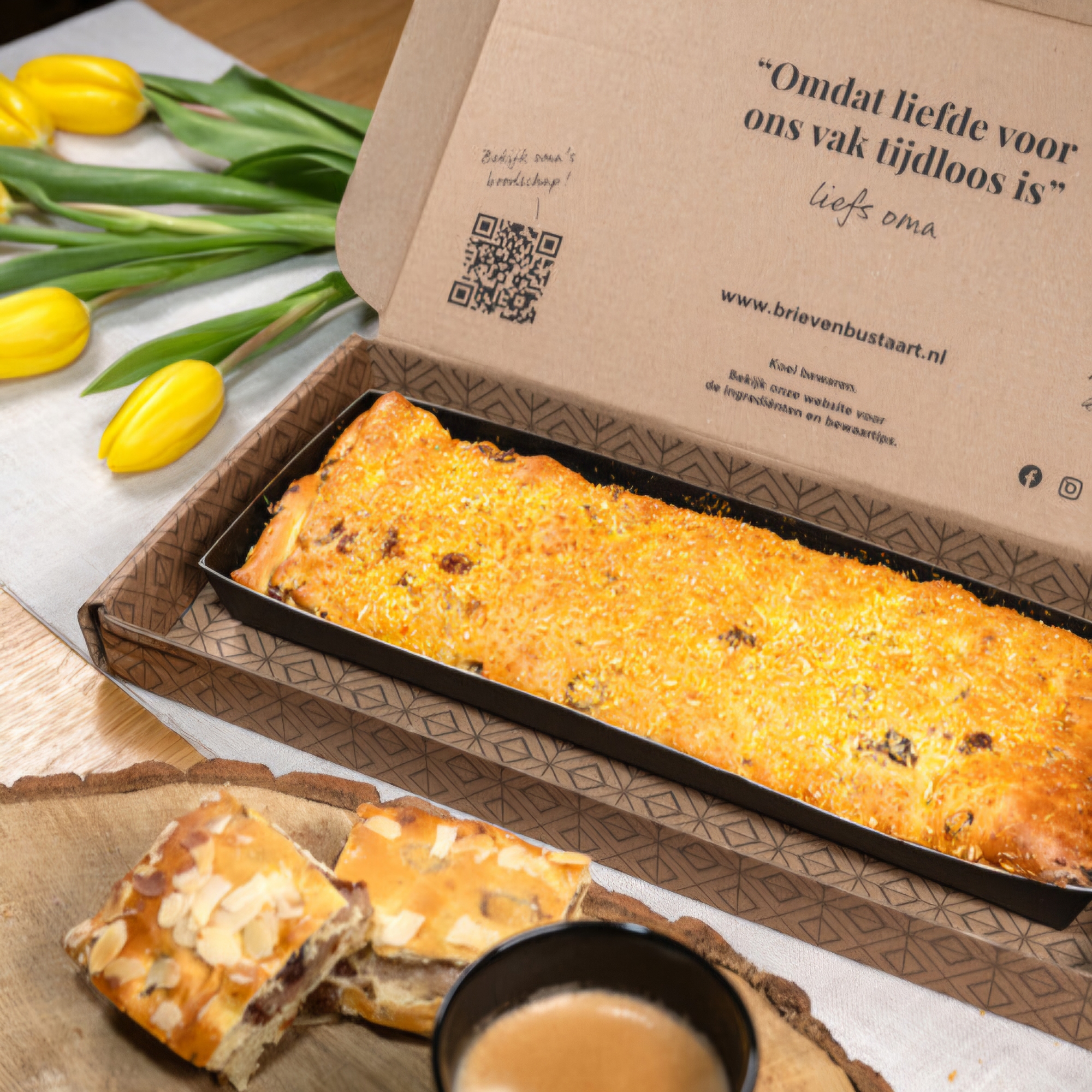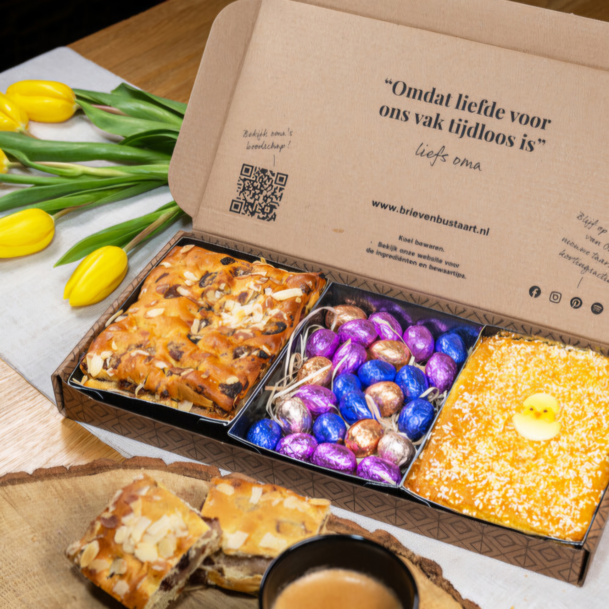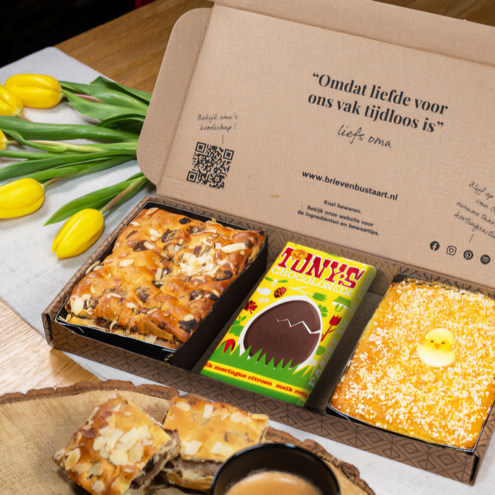 Speciaal voor de Paasdagen is ons Brievenbus Paaspakket een perfecte combinatie van ambachtelijke lekkernijen. Wat denk je van Paasstol, bereid met 100% roomboter, zuivere spijs en amarenakers voor een rijke smaak? Ook vind je in dit lekkernijenpakket een frisse Panettone cake terug, met smaken van sinaasappel, limoen en kokos. En dat is nog niet alles, want natuurlijk mag chocolade niet ontbreken tijdens de Paasdagen. Het chocolade paasei van Tony’s Chocolonely in de smaak citroen meringue maakt het helemaal compleet!