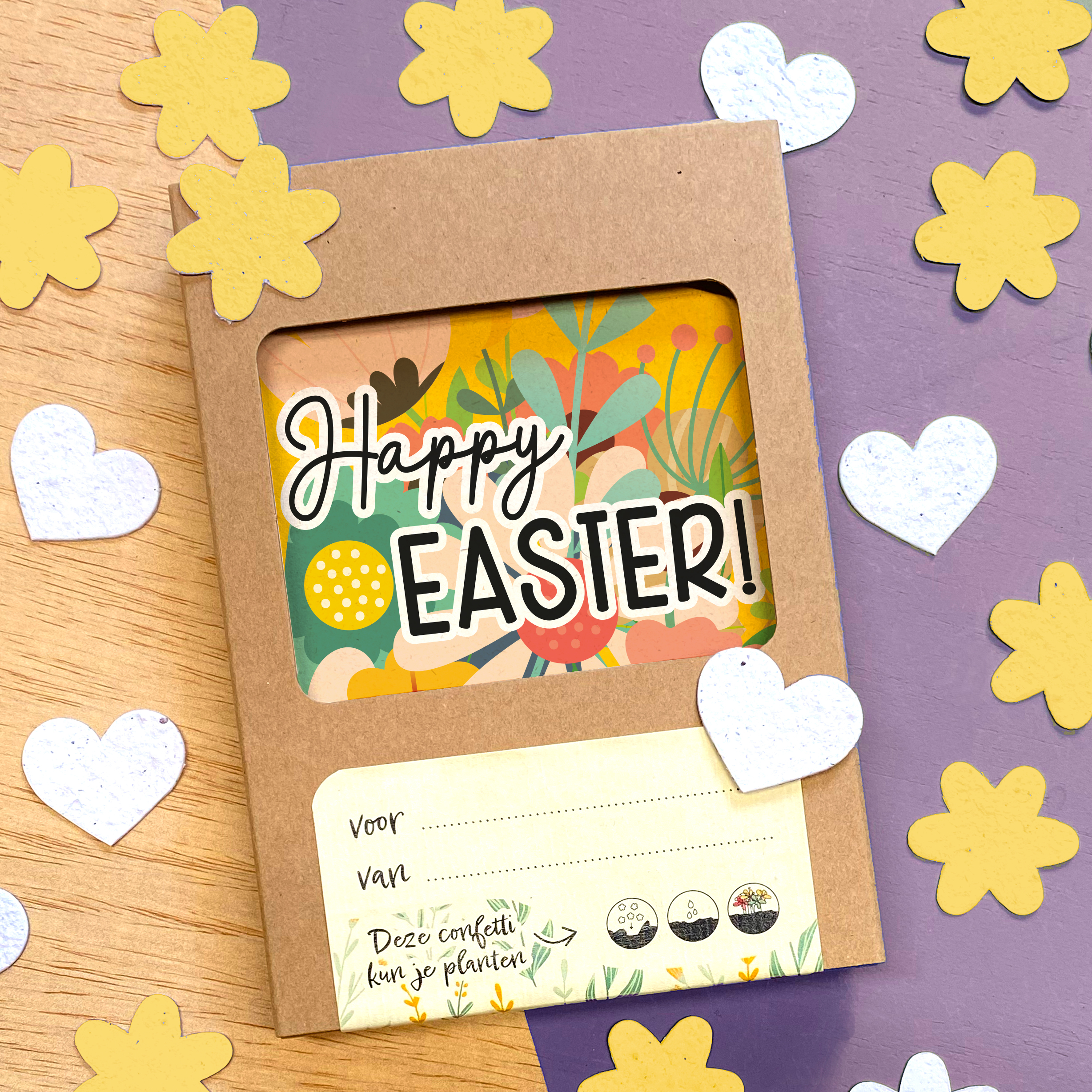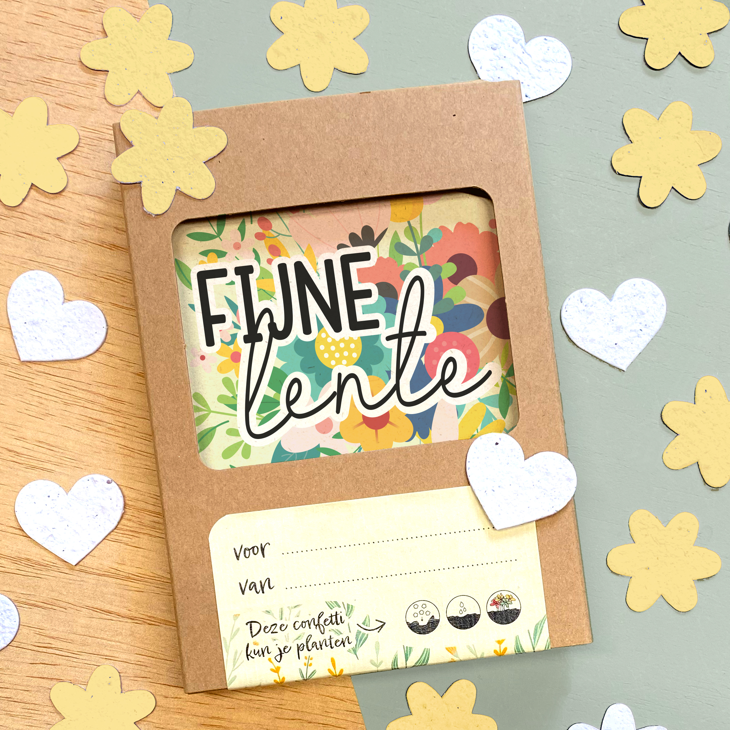 Vrolijk doosje vol bloeiconfetti die je zo in de tuin mag strooien. Bloeiconfetti (ongeveer 40 stuks per doosje) wordt gemaakt van gerecycled papier en bevat een mix van bij-vriendelijke bloemenzaden. Bloeiconfetti is ongeveer 3×3 cm groot. De bijgevoegde ansichtkaart is gemaakt van stevig papier (300 grams) van landbouwafval. Volledig te personaliseren met eigen tekst en/of logo. Past door de brievenbus.