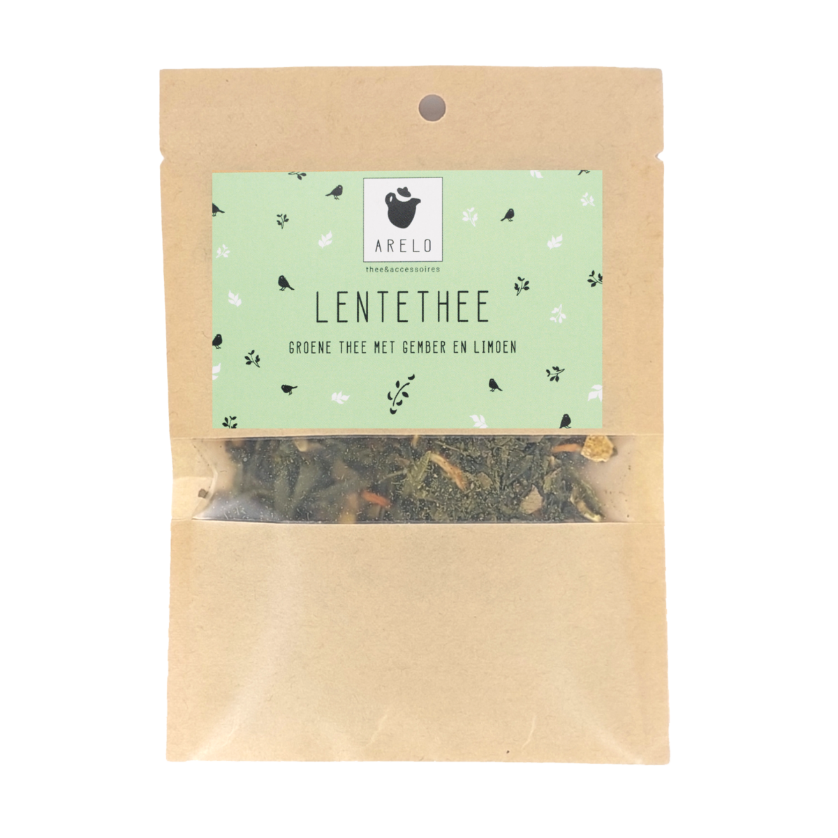 Zakje van 25 gram frisse groene thee met gember en limoen. Heerlijk voor bij de Paasbrunch.
