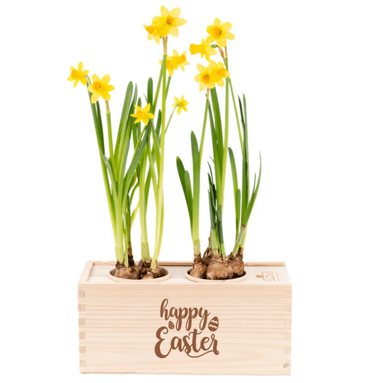 Het ultieme cadeau voor Pasen! De narcissen in de houten box ‘Happy Easter’ komen in bloei zo gauw de ontvanger de box vult met water. Zo haal je met Pasen het voorjaar in huis! De box is gemaakt van 100% duurzame materialen en wordt CO2-neutraal geproduceerd. De verzendverpakking is óók de plantenbak met ingebouwd waterreservoir.