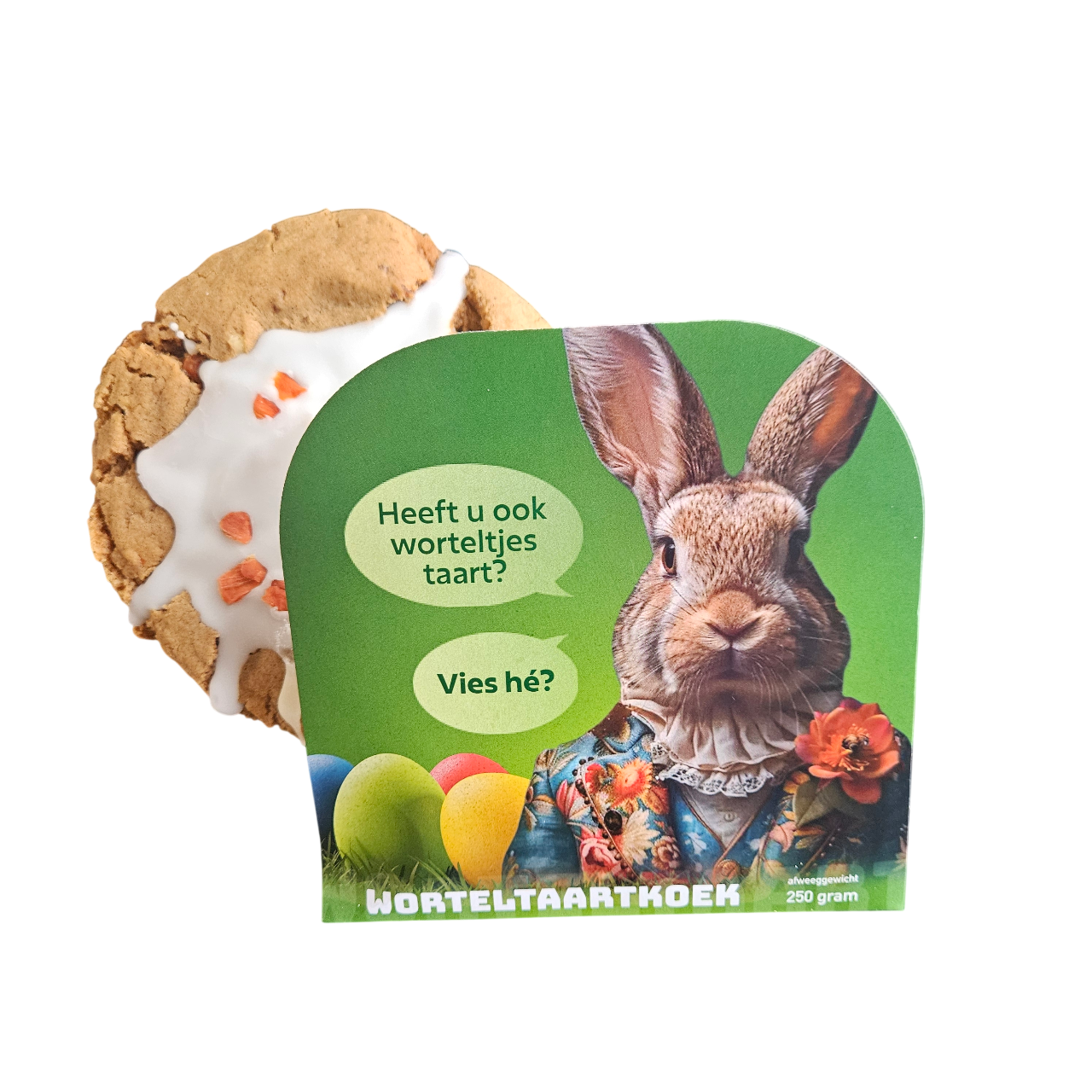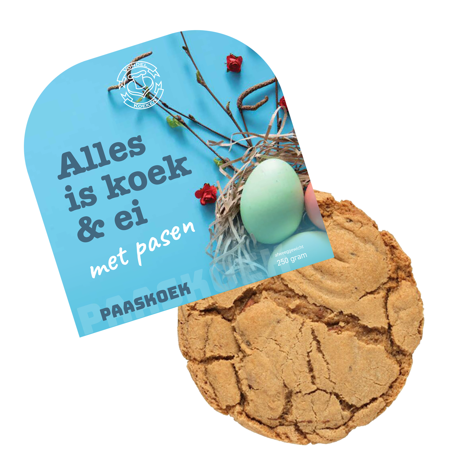 Een (h)eerlijke verse mix van vanille/chocolade koekjes in paaseivorm. Verpakt in themadoosje met een inhoud van 80 gram. Ook verkrijgbaar in brievenbusdoosje.